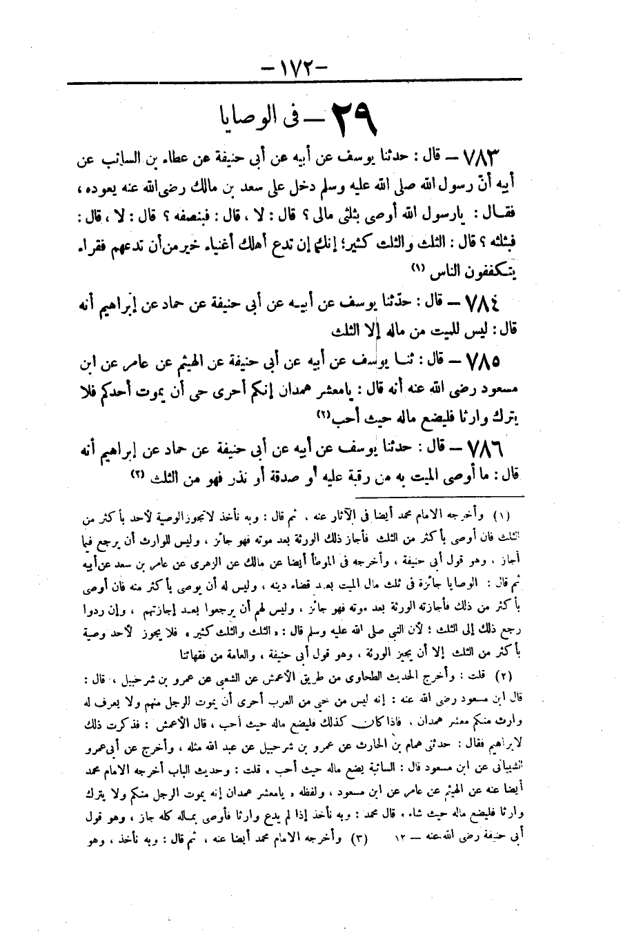 ٧٨٥ - قَالَ: ثنا يُوسُفُ عَنْ أَبِيهِ عَنْ أَبِي حَنِيفَةَ، عَنِ الْهَيْثَمِ، عَنْ عَامِرٍ، عَنِ ابْنِ مَسْعُودٍ رَضِيَ اللَّهُ عَنْهُ أَنَّهُ قَالَ: «يَا مَعْشَرَ هَمْدَانَ إِنَّكُمْ أَحْرَى حَيٍّ أَنْ يَمُوتَ أَحَدُكُمْ فَلَا يَتْرُكُ وَارِثًا فَلْيَضَعْ مَالَهُ حَيْثُ أَحَبَّ»