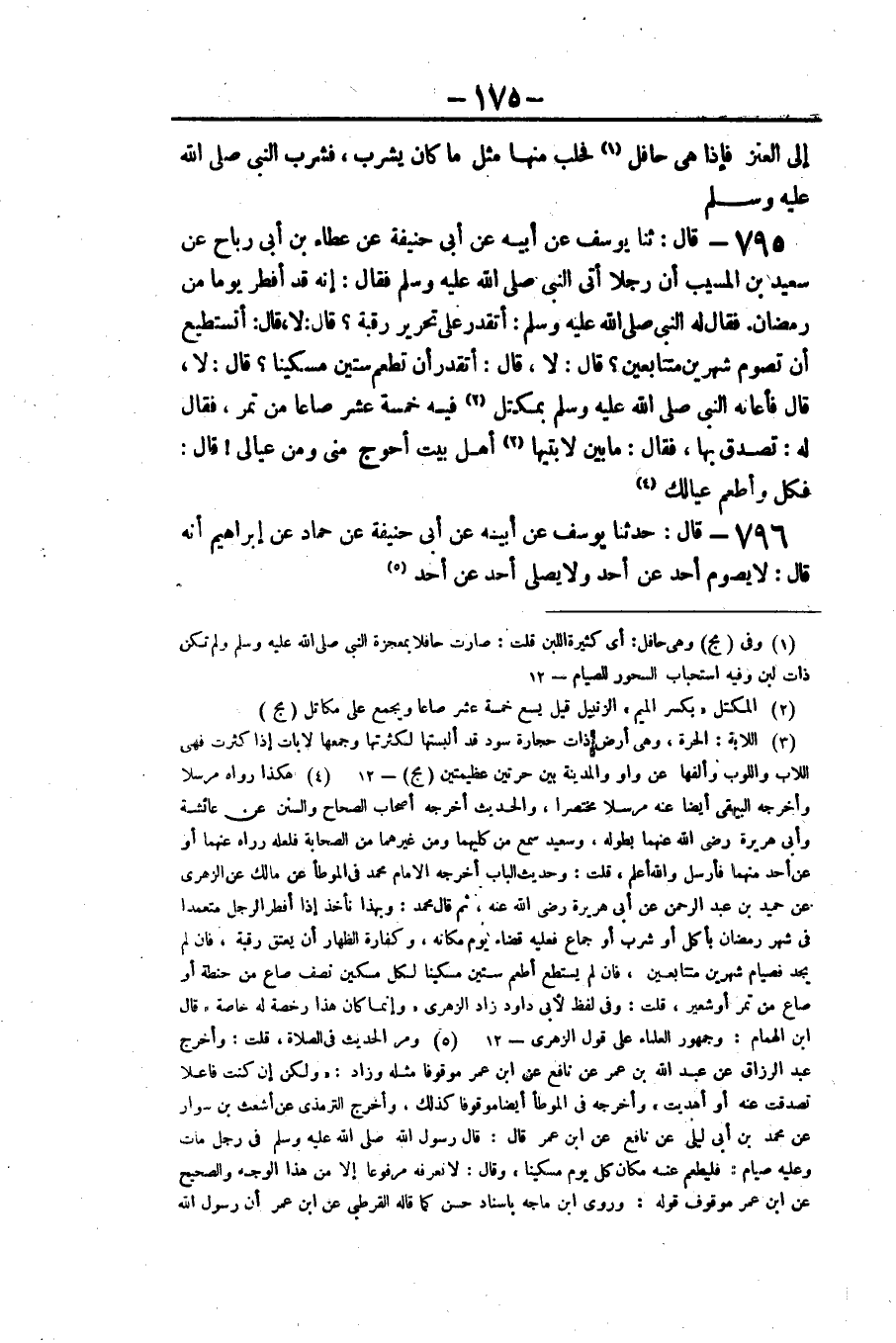 ٧٩٥ - قَالَ: ثنا يُوسُفُ عَنْ أَبِيهِ عَنْ أَبِي حَنِيفَةَ، عَنْ عَطَاءِ بْنِ أَبِي رَبَاحٍ، عَنْ سَعِيدِ بْنِ الْمُسَيِّبِ، أَنَّ رَجُلًا، أَتَى النَّبِيَّ صَلَّى اللهُ عَلَيْهِ وَسَلَّمَ فَقَالَ: إِنَّهُ قَدْ أَفْطَرَ يَوْمًا مِنْ رَمَضَانَ، فَقَالَ لَهُ النَّبِيُّ صَلَّى اللهُ عَلَيْهِ وَسَلَّمَ: «أَتَقْدِرُ عَلَى تَحْرِيرِ رَقَبَةٍ؟» قَالَ: لَا، قَالَ: «أَتَسْتَطِيعُ أَنْ تَصُومَ شَهْرَيْنِ مُتَتَابِعَيْنِ؟» قَالَ: لَا، قَالَ: «أَتَقْدِرُ أَنْ تُطْعِمَ سِتِّينَ مِسْكِينًا؟» قَالَ: لَا، قَالَ: فَأَعَانَهُ النَّبِيُّ صَلَّى اللهُ عَلَيْهِ وَسَلَّمَ بِمِكْتَلٍ فِيهِ خَمْسَةَ عَشَرَ صَاعًا مِنْ تَمْرٍ، فَقَالَ لَهُ: «تَصَدَّقْ بِهَا» فَقَالَ: مَا بَيْنَ لَابَتَيْهَا أَهْلُ بَيْتٍ أَحْوَجُ مِنِّي وَمِنْ عِيَالِي، قَالَ: «فَكُلْ وَأَطْعِمْ عِيَالَكَ»