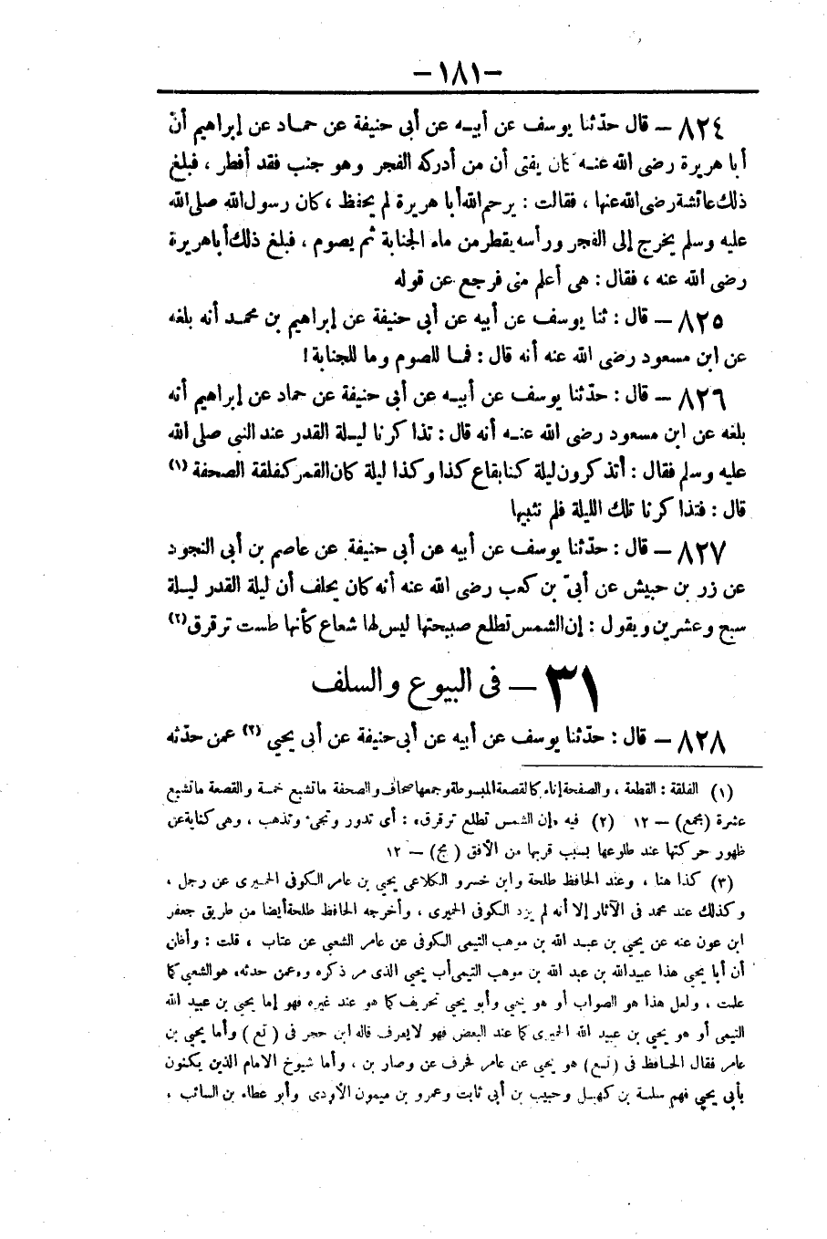 ٨٢٦ - قَالَ: حَدَّثَنَا يُوسُفُ عَنْ أَبِيهِ عَنْ أَبِي حَنِيفَةَ، عَنْ حَمَّادٍ، عَنْ إِبْرَاهِيمَ، أَنَّهُ بَلَغَهُ عَنِ ابْنِ مَسْعُودٍ رَضِيَ اللَّهُ عَنْهُ أَنَّهُ قَالَ: تَذَاكَرْنَا لَيْلَةَ الْقَدْرِ عِنْدَ النَّبِيِّ صَلَّى اللهُ عَلَيْهِ وَسَلَّمَ فَقَالَ: «أَتَذْكُرُونَ لَيْلَةَ كُنَّا بِقَاعِ كَذَا وَكَذَا لَيْلَةً، كَانَ الْقَمَرُ كَفَلْقَةِ الصَّحْفَةِ» قَالَ: فَتَذَاكَرْنَا تِلْكَ اللَّيْلَةَ فَلَمْ نُثْبِتْهَا