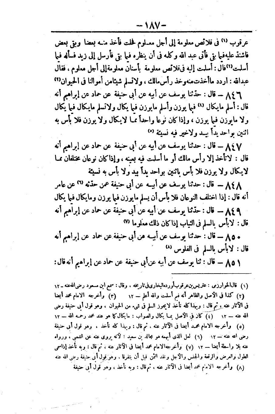 ٨٤٧ - قَالَ: حَدَّثَنَا يُوسُفُ عَنْ أَبِيهِ عَنْ أَبِي حَنِيفَةَ، عَنْ حَمَّادٍ، عَنْ إِبْرَاهِيمَ، أَنَّهُ قَالَ: «لَا تَأْخُذْ أَلَا رَأْسَ مَالِكَ أَوْ مَا أَسْلَمْتَ فِيهِ بِعَيْنِهِ، وَإِذَا كَانَ نَوْعَانِ مُخْتَلِفَانِ مِمَّا لَا يُكَالُ وَلَا يُوزَنُ فَلَا بَأْسَ بِاثْنَيْنِ بِوَاحِدٍ يَدًا بِيَدٍ، وَلَا بَأْسَ بِهِ نَسِيئَةً»