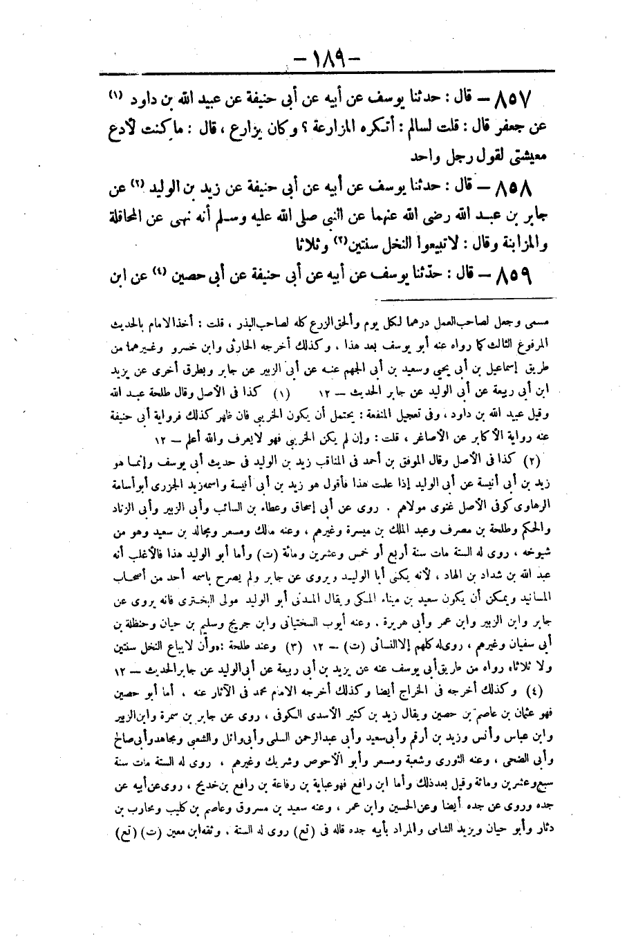 ٨٥٨ - قَالَ: حَدَّثَنَا يُوسُفُ عَنْ أَبِيهِ عَنْ أَبِي حَنِيفَةَ، عَنْ زَيْدِ بْنِ الْوَلِيدِ، عَنْ جَابِرِ بْنِ عَبْدِ اللَّهِ رَضِيَ اللَّهُ عَنْهُمَا، عَنِ النَّبِيِّ صَلَّى اللهُ عَلَيْهِ وَسَلَّمَ أَنَّهُ نَهَى عَنِ الْمُحَاقَلَةِ وَالْمُزَابَنَةِ وَقَالَ: «لَا تَبِيعُوا النَّخْلَ سَنَتَيْنِ وَثَلَاثًا»