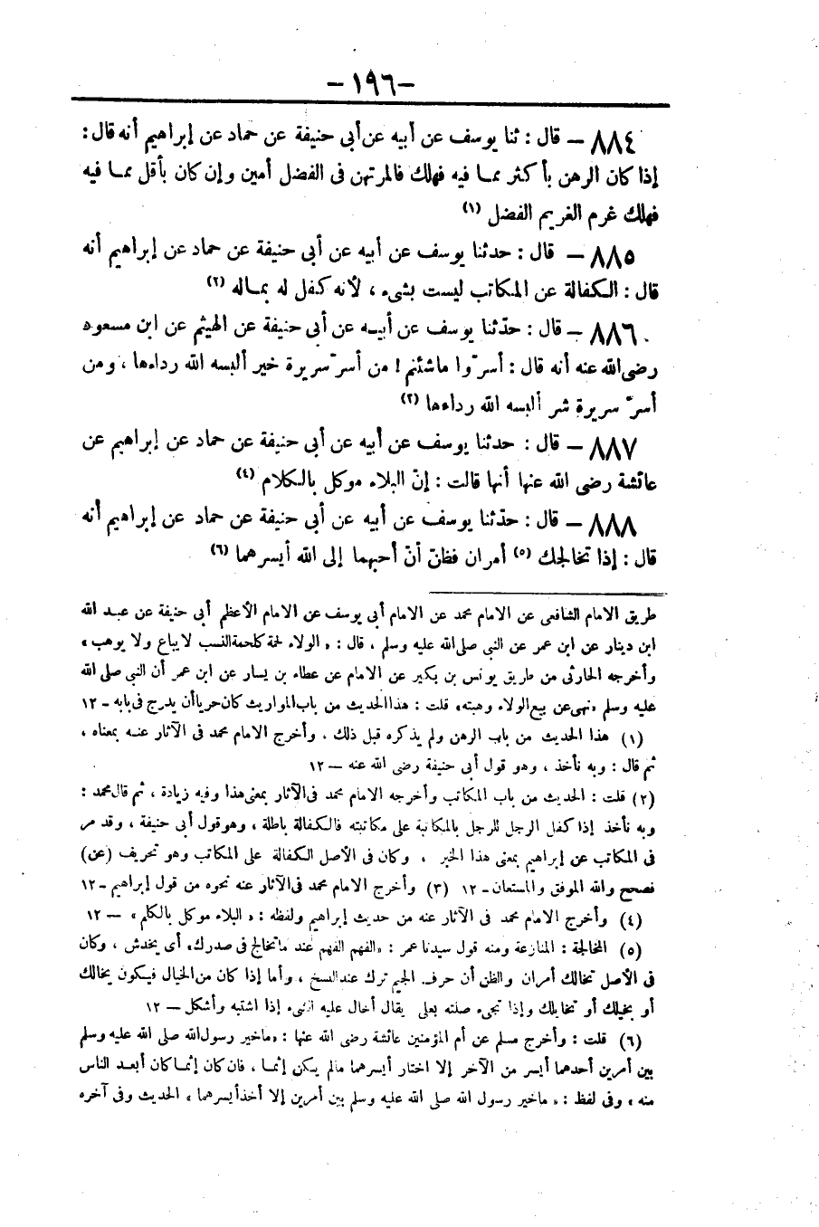٨٨٧ - قَالَ: حَدَّثَنَا يُوسُفُ عَنْ أَبِيهِ عَنْ أَبِي حَنِيفَةَ، عَنْ حَمَّادٍ، عَنْ إِبْرَاهِيمَ، عَنْ عَائِشَةَ رَضِيَ اللَّهُ عَنْهَا أَنَّهَا قَالَتْ: «إِنَّ الْبَلَاءَ مُوَكَّلٌ بِالْكَلَامِ»