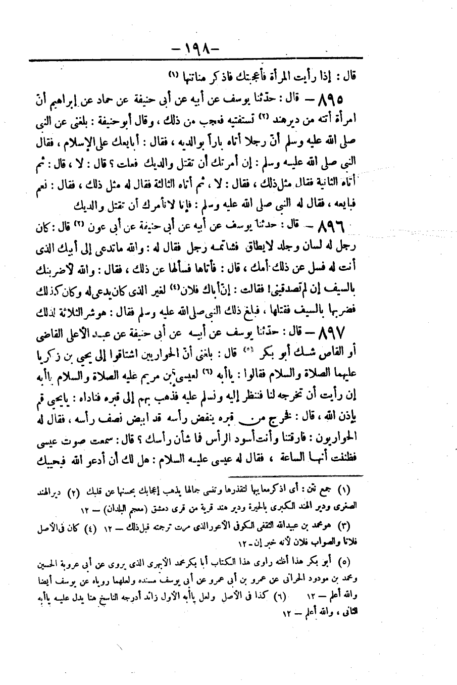 ٨٩٥ - قَالَ: حَدَّثَنَا يُوسُفُ عَنْ أَبِيهِ عَنْ أَبِي حَنِيفَةَ، عَنْ حَمَّادٍ، عَنْ إِبْرَاهِيمَ، «أَنَّ امْرَأَةً أَتَتْهُ مِنْ دَيْرِ هِنْدَ تَسْتَفْتِيهِ فَعَجِبَ مِنْ ذَلِكَ»