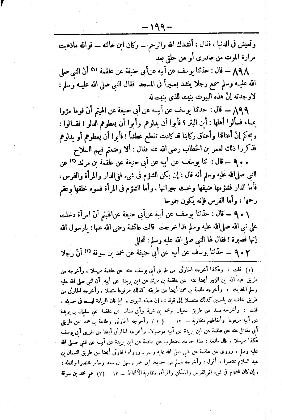 ٩٠٠ - قَالَ: ثنا يُوسُفُ عَنْ أَبِيهِ عَنْ أَبِي حَنِيفَةَ، عَنْ عَلْقَمَةَ بْنِ مَرْثَدٍ، عَنِ النَّبِيِّ صَلَّى اللهُ عَلَيْهِ وَسَلَّمَ أَنَّهُ قَالَ: «إِنْ يَكُنِ الشُّؤْمُ فِي شَيْءٍ فَفِي الدَّارِ وَالْمَرْأَةِ وَالْفَرَسِ، فَأَمَّا الدَّارُ فَشُؤْمُهَا ضِيقُهَا وَخُبْثُ جِيرَانِهَا، وَأَمَّا الشُّؤْمُ فِي الْمَرْأَةِ فَسُوءُ خُلُقِهَا وَعُقْمُ رَحِمِهَا، وَأَمَّا الْفَرَسُ فَإِنَّهُ يَكُونُ جَمُوحًا»