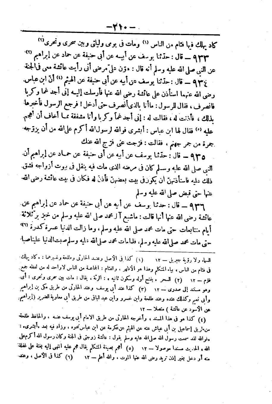 ٩٣٥ - قَالَ: حَدَّثَنَا يُوسُفُ عَنْ أَبِيهِ عَنْ أَبِي حَنِيفَةَ، عَنْ حَمَّادٍ، عَنْ إِبْرَاهِيمَ، «أَنَّ النَّبِيَّ صَلَّى اللهُ عَلَيْهِ وَسَلَّمَ كَانَ فِي مَرَضِهِ الَّذِي مَاتَ فِيهِ يُنْقَلُ فِي بُيُوتِ أَزْوَاجِهِ، فَشَقَّ ذَلِكَ عَلَيْهِ، فَاسْتَأْذَنَهُنَّ أَنْ يَكُونَ فِي بَيْتِ بَعْضِهِنَّ فَأَذِنَّ لَهُ، فَكَانَ فِي بَيْتِ عَائِشَةَ رَضِيَ اللَّهُ عَنْهَا حَتَّى قُبِضَ صَلَّى اللهُ عَلَيْهِ وَسَلَّمَ»