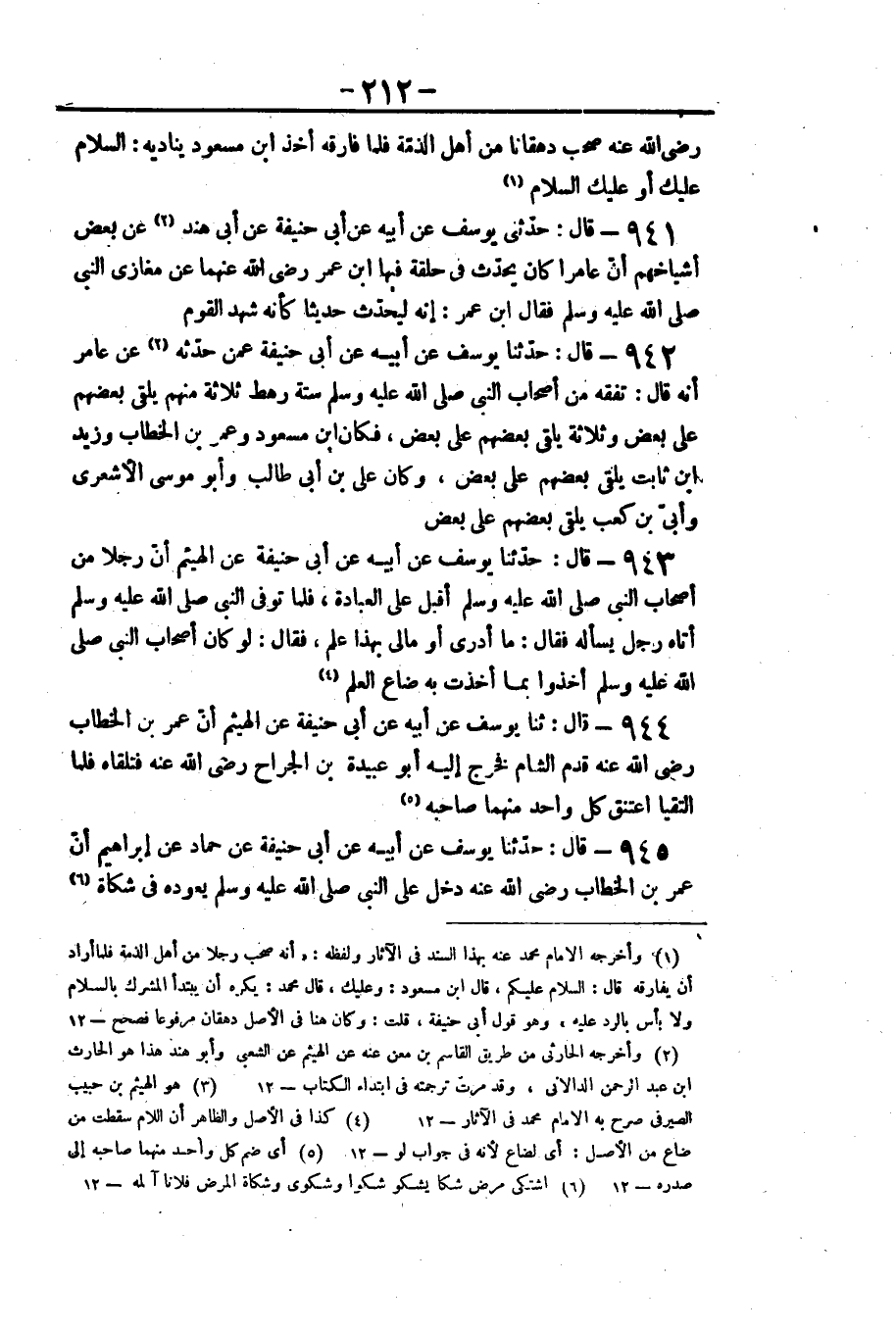 ٩٤٤ - قَالَ: ثنا يُوسُفُ عَنْ أَبِيهِ عَنْ أَبِي حَنِيفَةَ، عَنِ الْهَيْثَمِ، أَنَّ «عُمَرَ بْنَ الْخَطَّابِ رَضِيَ اللَّهُ عَنْهُ، قَدِمَ الشَّامَ فَخَرَجَ إِلَيْهِ أَبُو عُبَيْدَةَ بْنُ الْجَرَّاحِ رَضِيَ اللَّهُ عَنْهُ، فَتَلَقَّاهُ، فَلَمَّا الْتَقَيَا اعْتَنَقَ كُلُّ وَاحِدٍ مِنْهُمَا صَاحِبَهُ»