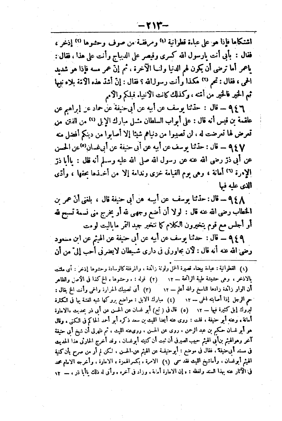 ٩٤٧ - قَالَ: حَدَّثَنَا يُوسُفُ عَنْ أَبِيهِ عَنْ أَبِي حَنِيفَةَ، عَنْ أَبِي غَسَّانَ، عَنِ الْحَسَنِ، عَنْ أَبِي ذَرٍّ رَضِيَ اللَّهُ عَنْهُ، عَنْ رَسُولِ اللَّهِ صَلَّى اللهُ عَلَيْهِ وَسَلَّمَ أَنَّهُ قَالَ: «يَا أَبَا ذَرٍّ، الْإِمْرَةُ أَمَانَةٌ، وَهِيَ يَوْمَ الْقِيَامَةِ خِزْيٌ وَنَدَامَةٌ، إِلَّا مَنْ أَخَذَهَا بِحَقِّهَا وَأَدَّى الَّذِي عَلَيْهِ فِيهَا»