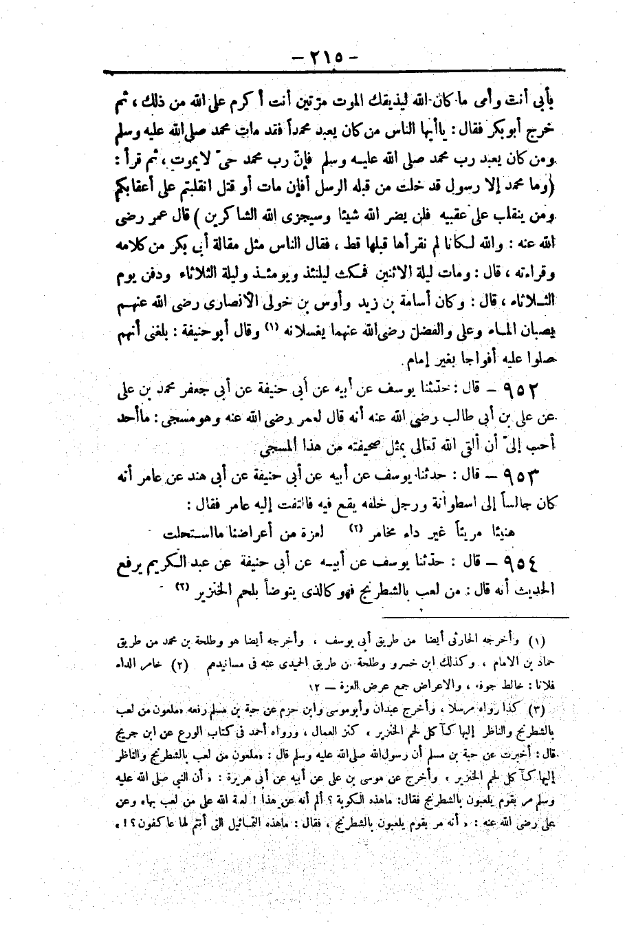 ٩٥٢ - قَالَ: حَدَّثَنَا يُوسُفُ، عَنْ أَبِيهِ، عَنْ أَبِي حَنِيفَةَ، عَنْ أَبِي جَعْفَرٍ مُحَمَّدِ بْنِ عَلِيٍّ، عَنْ عَلِيِّ بْنِ أَبِي طَالِبٍ رَضِيَ اللَّهُ عَنْهُ أَنَّهُ قَالَ لِعُمَرَ رَضِيَ اللَّهُ عَنْهُ وَهُوَ مُسَجًّى: «مَا أَحَدٌ أَحَبُّ إِلَيَّ أَنْ أَلْقَى اللَّهَ تَعَالَى بِمِثْلِ صَحِيفَتِهِ مِنْ هَذَا الْمُسَجَّى»