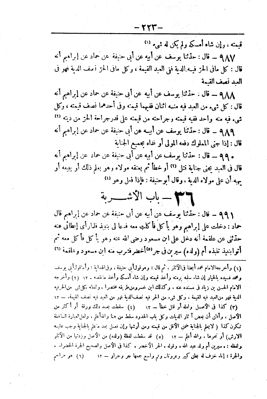 ٩٩٠ - قَالَ: حَدَّثَنَا يُوسُفُ عَنْ أَبِيهِ عَنْ أَبِي حَنِيفَةَ، عَنْ حَمَّادٍ، عَنْ إِبْرَاهِيمَ، أَنَّهُ قَالَ فِي «الْعَبْدِ يَجْنِي جِنَايَةَ قَتْلٍ أَوْ خَطَإٍ، ثُمَّ يُعْتِقُهُ مَوْلَاهُ، وَهُوَ يَعْلَمُ ذَلِكَ أَوْ يَبِيعُهُ أَوْ يَهَبُهُ أَنَّ عَلَى مَوْلَاهُ الدِّيَةَ» ، وَقَالَ أَبُو حَنِيفَةَ: فَإِذَا فَعَلَ وَهُوَ. . . . . . . . .
