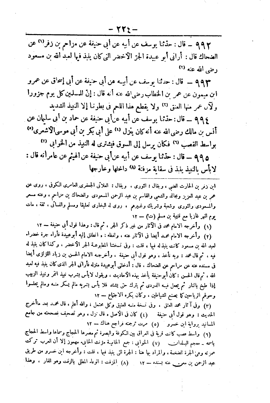 ٩٩٢ - قَالَ: حَدَّثَنَا يُوسُفُ عَنْ أَبِيهِ عَنْ أَبِي حَنِيفَةَ، عَنْ مُزَاحِمِ بْنِ زُفَرَ، عَنِ الضَّحَّاكِ، قَالَ: «أَرَانِي أَبُو عُبَيْدَةَ الْجَرَّ الْأَخْضَرَ الَّتِي كَانَ يُنْبَذُ فِيهَا لِعَبْدِ اللَّهِ بْنِ مَسْعُودٍ رَضِيَ اللَّهُ عَنْهُ»