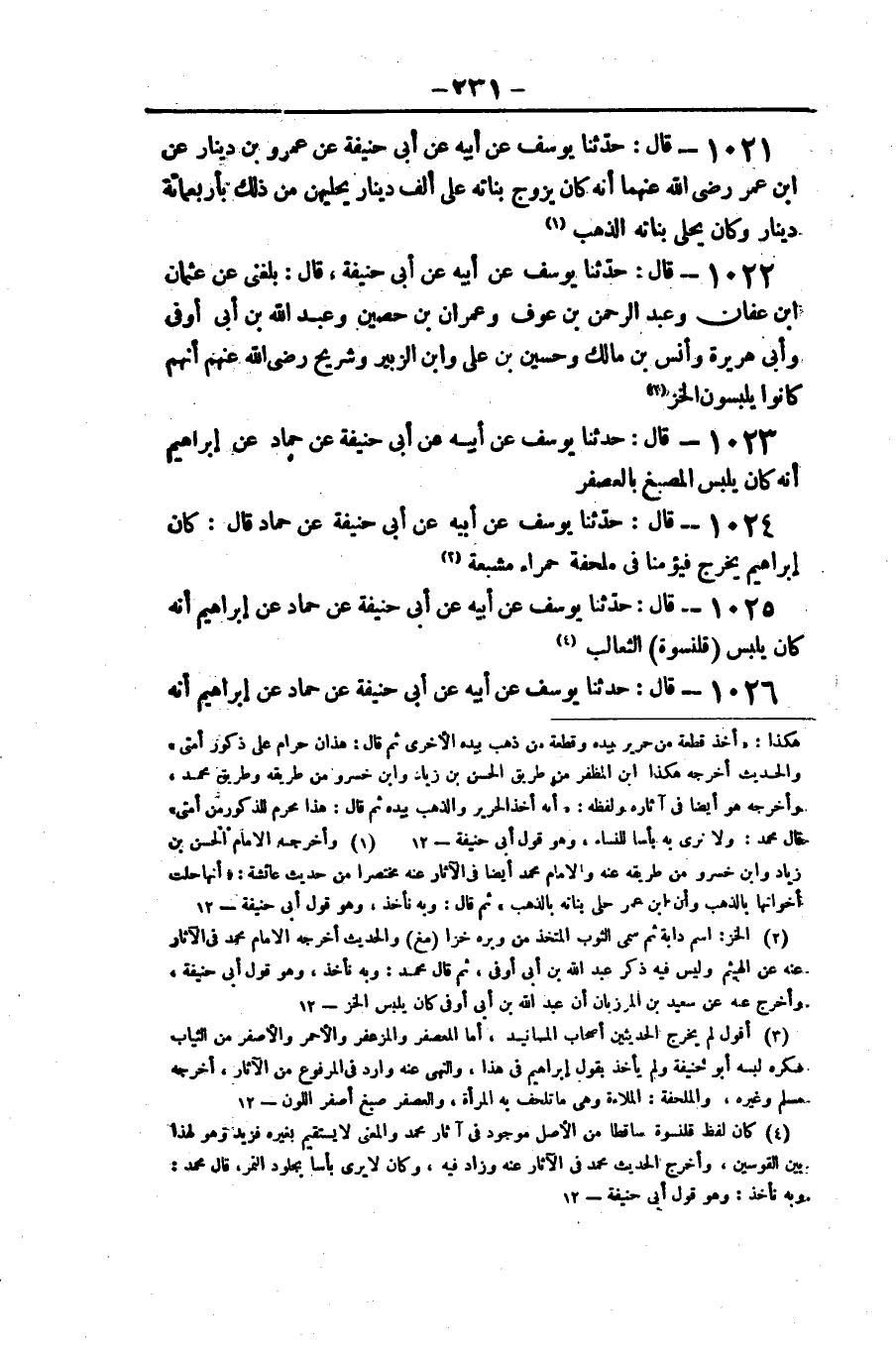 ١٠٢٣ - قَالَ: حَدَّثَنَا يُوسُفُ عَنْ أَبِيهِ عَنْ أَبِي حَنِيفَةَ، عَنْ حَمَّادٍ، عَنْ إِبْرَاهِيمَ، «أَنَّهُ كَانَ يَلْبَسُ الْمُصَبَّغَ بِالْعُصْفُرِ»