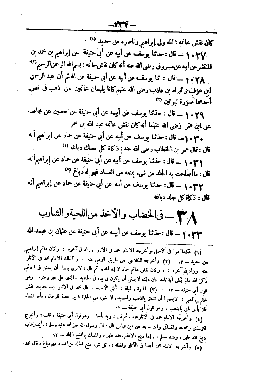 ١٠٢٨ - قَالَ: ثنا يُوسُفُ عَنْ أَبِيهِ عَنْ أَبِي حَنِيفَةَ، عَنِ الْهَيْثَمِ، «أَنَّ عَبْدَ الرَّحْمَنِ بْنَ عَوْفٍ، وَالْبَرَاءَ بْنَ عَازِبٍ رَضِيَ اللَّهُ عَنْهُمْ كَانَا يَلْبَسَانِ خَاتَمَيْنِ مِنْ ذَهَبٍ فِي فَصِّ أَحَدِهِمَا صُورَةُ لَبْوَتَيْنِ»