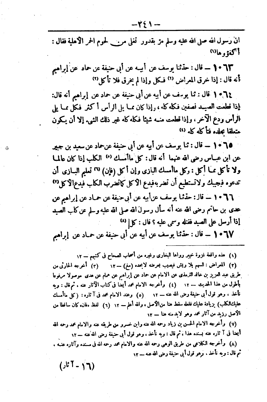 ١٠٦٦ - قَالَ: حَدَّثَنَا يُوسُفُ عَنْ أَبِيهِ عَنْ أَبِي حَنِيفَةَ، عَنْ حَمَّادٍ، عَنْ إِبْرَاهِيمَ، عَنْ عَدِيِّ بْنِ حَاتِمٍ رَضِيَ اللَّهُ عَنْهُ، أَنَّهُ سَأَلَ رَسُولَ اللَّهِ صَلَّى اللهُ عَلَيْهِ وَسَلَّمَ عَنْ كَلْبِ الصَّيْدِ إِذَا أُرْسِلَ عَلَى الصَّيْدِ فَقَتَلَهُ وَسَمَّى عَلَيْهِ، قَالَ: «كُلْ»