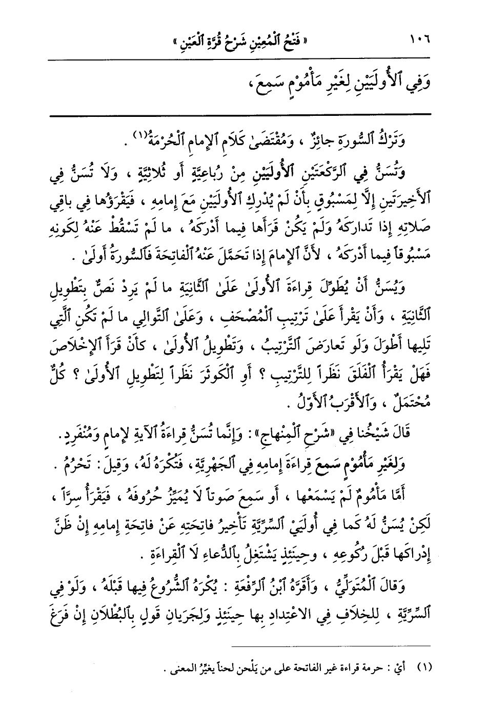 ولغير مأموم سمع قراءة إمامه في الجهرية فتكره له وقيل: تحرم أما مأموم لم يسمعها أو سمع صوتا لا يميز حروفه فيقرأ سرا لكن يسن له كما في أوليي السرية تأخير فاتحته عن فاتحة إمامه إن ظن إدراكها قبل ركوعه وحينئذ يشتغل بالدعاء لا القراءة.