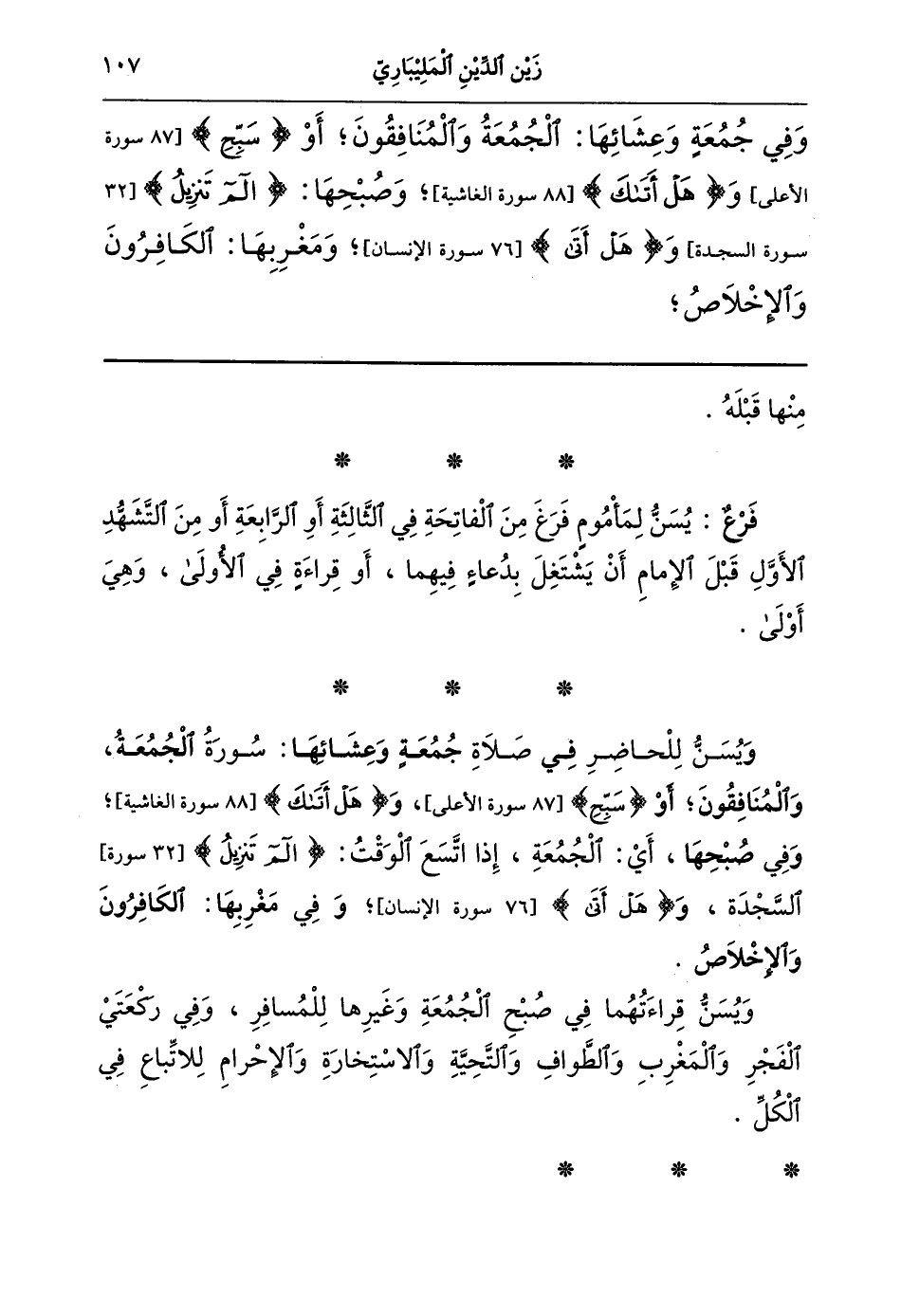 وفي جمعة وعشائها الجمعة والمنافقون أو {سَبِّحِ} 87 سورة الأعلى {هَلْ أَتَاكَ} [88 سورة: الغاشية] وصبحها: {الم تَنْزِيلُ} [32 سورة السجدة] و {هَلْ أَتَى} [76 سورة الإنسان] ومغربها: الكافرون والإخلاص.