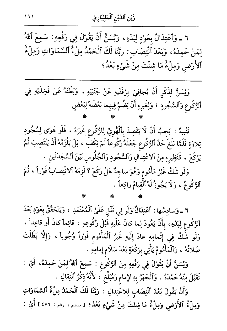 6- واعتدال بعود لبدء ويسن أن يقول في رفعه: سمع الله لمن حمده وبعد انتصاب ربنا لك الحمد ملء السماوات وملء الأرض وملء ما شئت من شيء بعد,