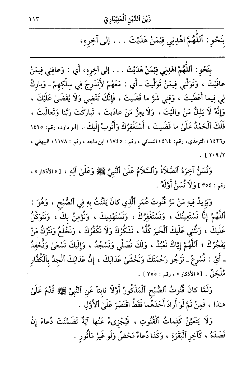 بنحو: اللهم اهدني فيمن هديت إلى آخره أي وعافني فيمن عافيت وتولني فيمن توليت أي معهم لا ندرج في سلكهم وبارك لي فيما أعطيت وقني شر ما قضيت فإنك تقضي ولا يقضى عليك وإنه لا يذل من واليت ولا يعز من عاديت تباركت ربنا وتعاليت فلك الحمد على ما قضيت أستغفرك وأتوب إليك. [أبو داود رقم: 425, 1426, الترمذي رقم: 464, النسائي, رقم: 1745, ابن ماجه رقم: 1178, البيهقي 2/209] .