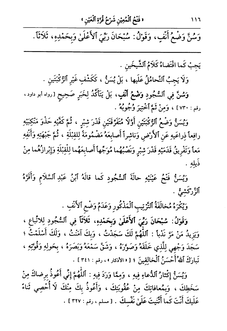 وقول: سبحان ربي الأعلى وبحمده ثلاثا في السجود للاتباع ويزيد من مر ندبا: اللهم لك سجدت وبك آمنت ولك أسلمت سجد وجهي للذي خلقه وصوره وشق سمعه وبصره بحوله وقوته تبارك الله أحسن الخالقين. [الأذكار رقم: 341] .