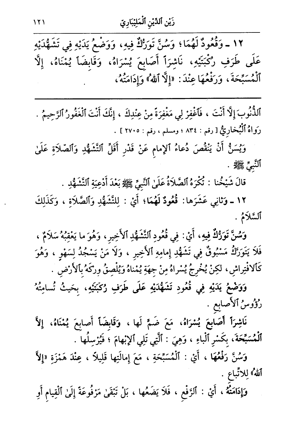 12- وقعود لهما وسن تورك فيه ووضع يديه في تشهديه على طرف ركبتيه ناشرا أصابع يسراه وقابضا يمناه إلا المسبحة ورفعها عند: إلا الله وإدامته,