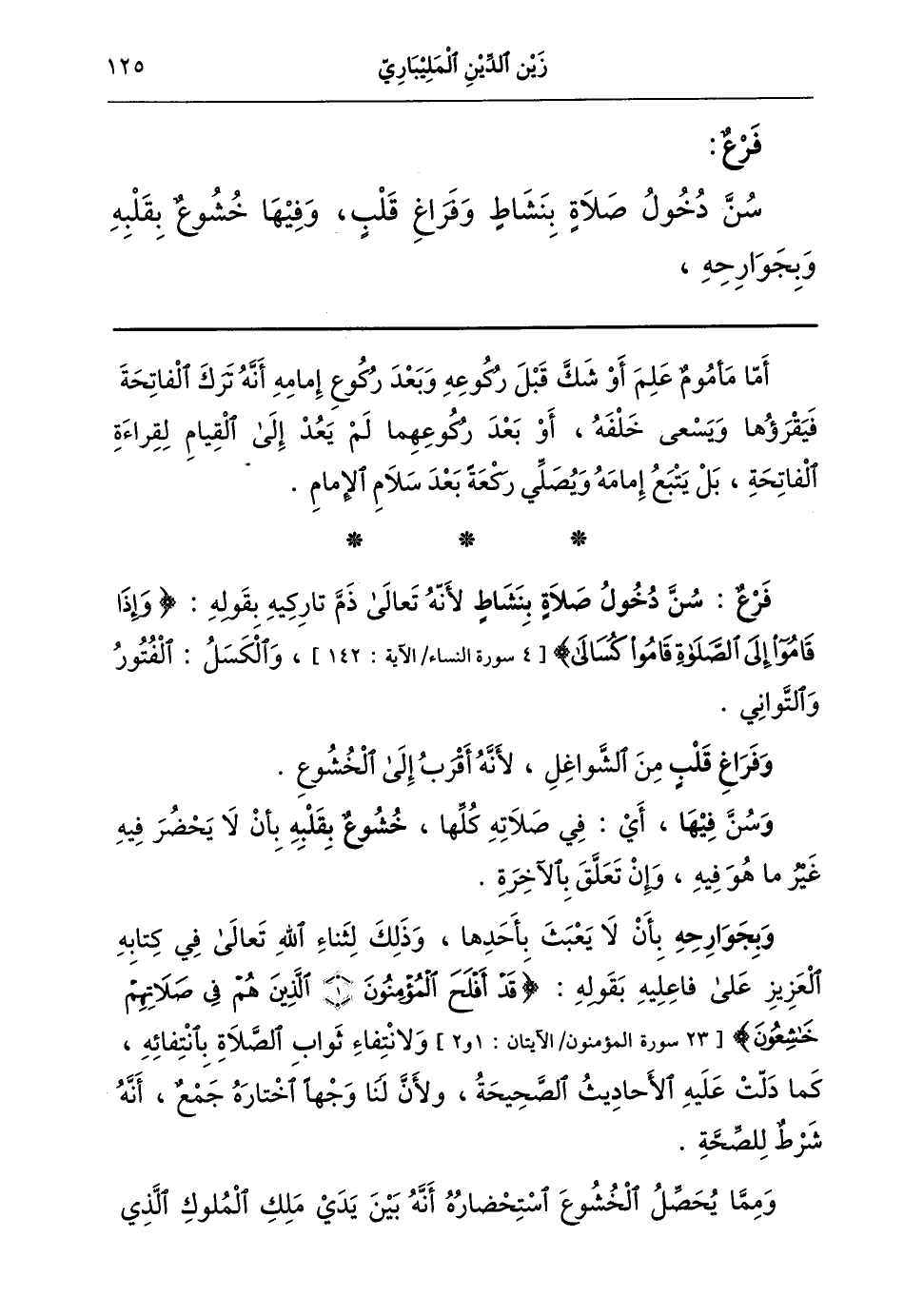 فرع سن دخول صلاة بنشاط لأنه تعالى ذم تاركيه بقوله: {وَإِذَا قَامُوا إِلَى الصَّلاةِ قَامُوا كُسَالَى} [4- سورة النساء /الآية: 142] والكسل: الفتور والتواني.