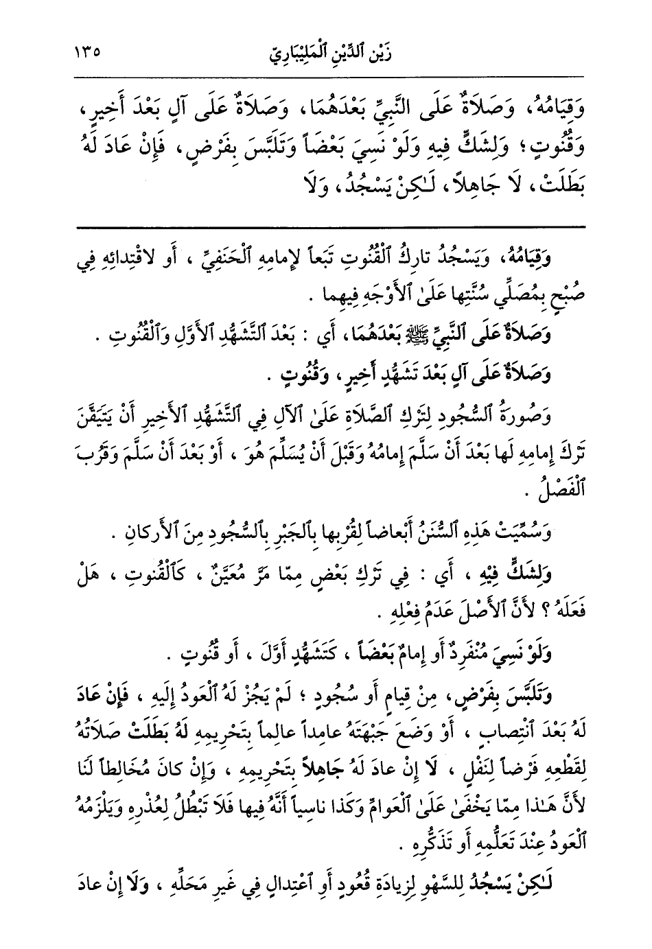 وقيامه وصلاة على النبي بعدهما وصلاة على آل بعد أخير وقنوت ولشك فيه ولو نسي بعضا وتلبس بفرض فإن عاد له بطلت لا جاهلا لكن يسجد ولا