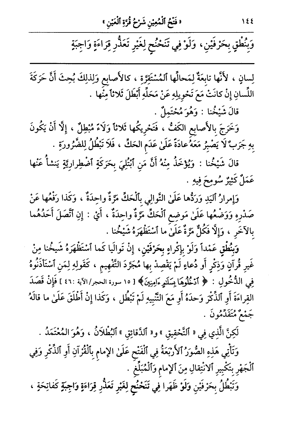 وبنطق عمدا ولو بإكراه بحرفين إن تواليا كما استظهره شيخنا من غير قرآن وذكر أو دعاء لم يقصد بها مجرد التفهيم كقوله لمن استأذنوه في الدخول: {ادْخُلُوهَا بِسَلامٍ آمِنِينَ} [15 سورة الحجر الآية: 46] فإن قصد القراءة أو الذكر وحده أو مع التنبيه لم تبطل وكذا إن أطلق على ما قاله جمع متقدمون.