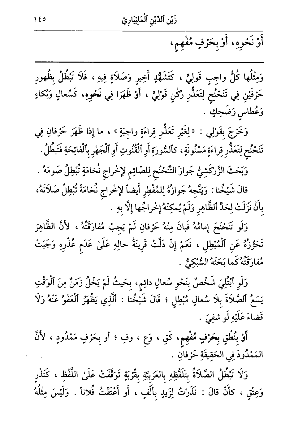 ولا تبطل الصلاة بتلفظه بالعربية بقربة توقفت على اللفظ كنذر وعتق كأن قال: نذرت لزيد بألف أو أعتقت فلانا وليس مثله