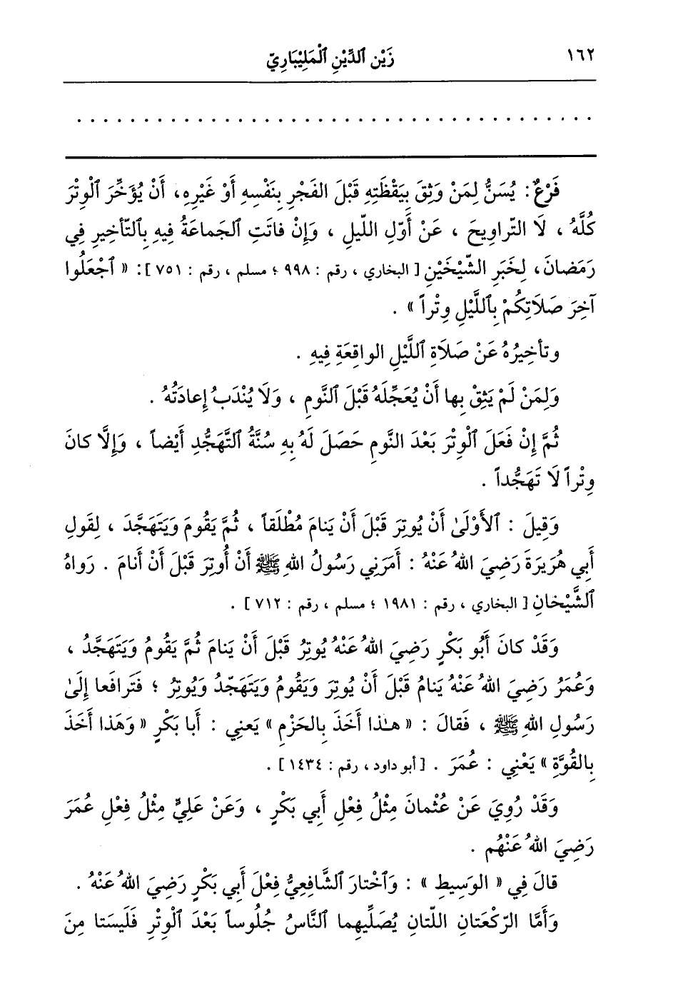 وقيل: الأولى أن يوتر قبل أن ينام مطلقا ثم يقوم ويتهجد لقول أبي هريرة رضي الله عنه: أمرني رسول الله صلى الله عليه وسلم أن أوتر قبل أن أنام رواه الشيخان [البخاري رقم: 1981, مسلم رقم: 712] .