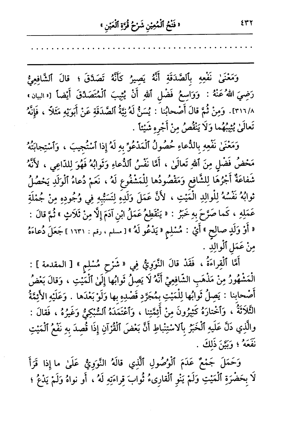 ومعنى نفعه بالدعاء حصول المدعو به له إذا استجيب واستجابته محض فضل من الله تعالى أما نفس الدعاء وثوابه فهو للداعي لأنه شفاعة أجرها للشافع ومقصودها للمشفوع له نعم دعاء الولد يحصل ثوابه نفسه للوالد الميت لان عمل ولده لتسببه في وجوده من جملة عمله كما صرح به خبر: "ينقطع عمل ابن آدم إلا من ثلاث" ثم قال: "أو ولد صالح" أي مسلم "يدعو له" [مسلم رقم: 1631] حمل دعاءه من عمل الوالد.