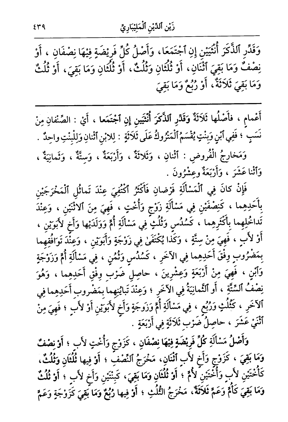 وقدر الذكر أنثيين إن اجتمعا وأصل كل فريضة فيها نصفان أو نصف وما بقي اثنان أو ثلثان وثلث أو ثلثان وما بقي أو ثلث وما بقي ثلاثة أو ربع وما بقي