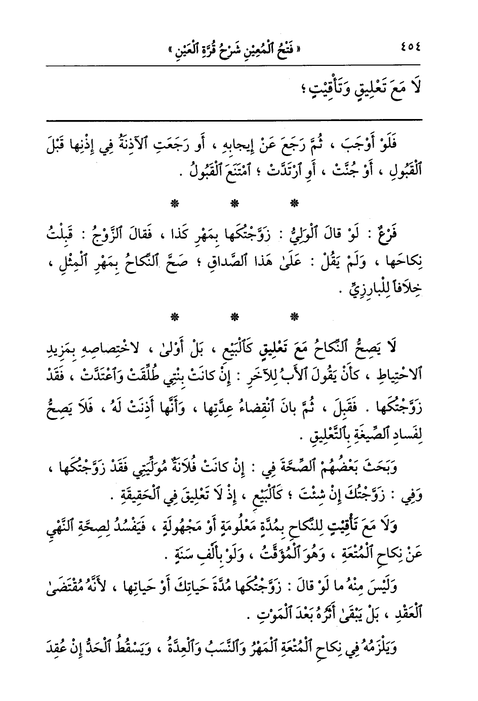 لا يصح النكاح مع تعليق كالبيع بل أولى لاختصاصه بمزيد الاحتياط: كأن يقول الأب للآخر إن كانت بنتي طلقت أو اعتدت فقد زوجتكها فقبل ثم بان انقضاء عدتها وأنها أذنت له: فلا يصح لفساد الصيغة بالتعليق.