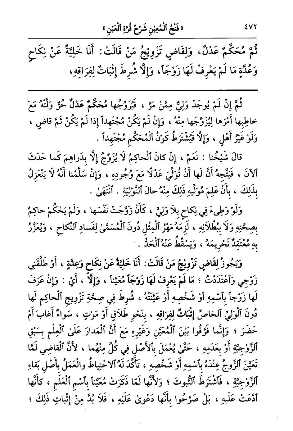 ويجوز لقاض تزويج من قالت أنا خلية عن نكاح وعدة أو طلقني زوجي واعتددت ما لم يعرف لها زوجا معينا وإلا أي وإن عرف لها زوجا باسمه أو شخصه أو عينته شرط في صحة تزويج الحاكم لها دون الولي الخاص إثبات لفراقه بنحو طلاق أو موت سواء أغاب أم حضر وإنما فرقوا بين المعين وغيره مع أن المدار والعلم يسبق الزوجية أو بعدمه حتى يعمل بالأصل في كل منهما لان القاضي لما تعين الزوج عنده باسمه أو شخصه تأكد له الاحتياط والعمل بأصل بقاء الزوجية فاشترط الثبوت ولأنها لما ذكرت معينا باسم العلم كأنها ادعت عليه بل صرحوا بأنها دعوى عليه فلا بد من إثبات ذلك