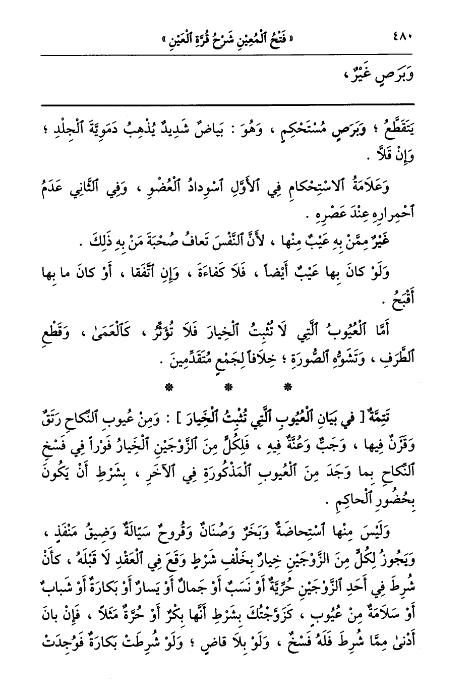 تتمة [في بيان العيوب التي تثبت الخيار] ومن عيوب النكاح رتق وقرن فيها وجب وعنة فيه فلكل من الزوجين الخيار فورا في فسخ النكاح بما وجد من العيوب المذكورة في الآخر بشرط أن يكون بحضور الحاكم.