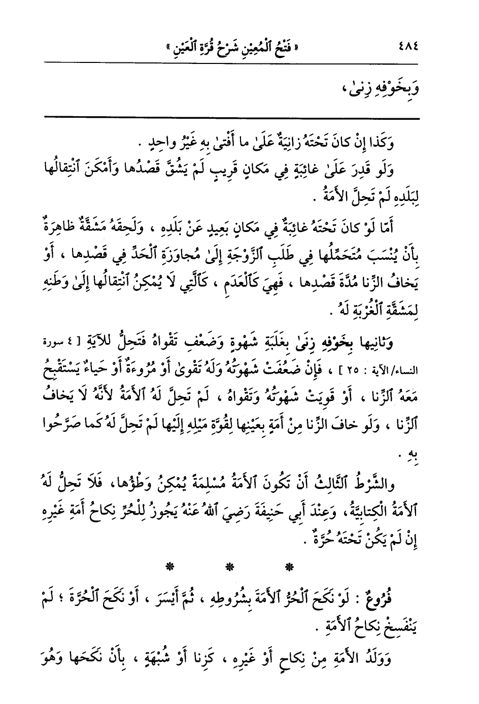 وثانيها بخوفه زنا بغلبة شهوة وضعف تقواه فتحل للآية [4 سورة النساء الآية: 25] فإن ضعفت شهوته وله تقوى أو مروءة أو حياء يستقبح معه الزنا أو قويت شهوته وتقواه لم تحل له الأمة لأنه لا يخاف الزنا.