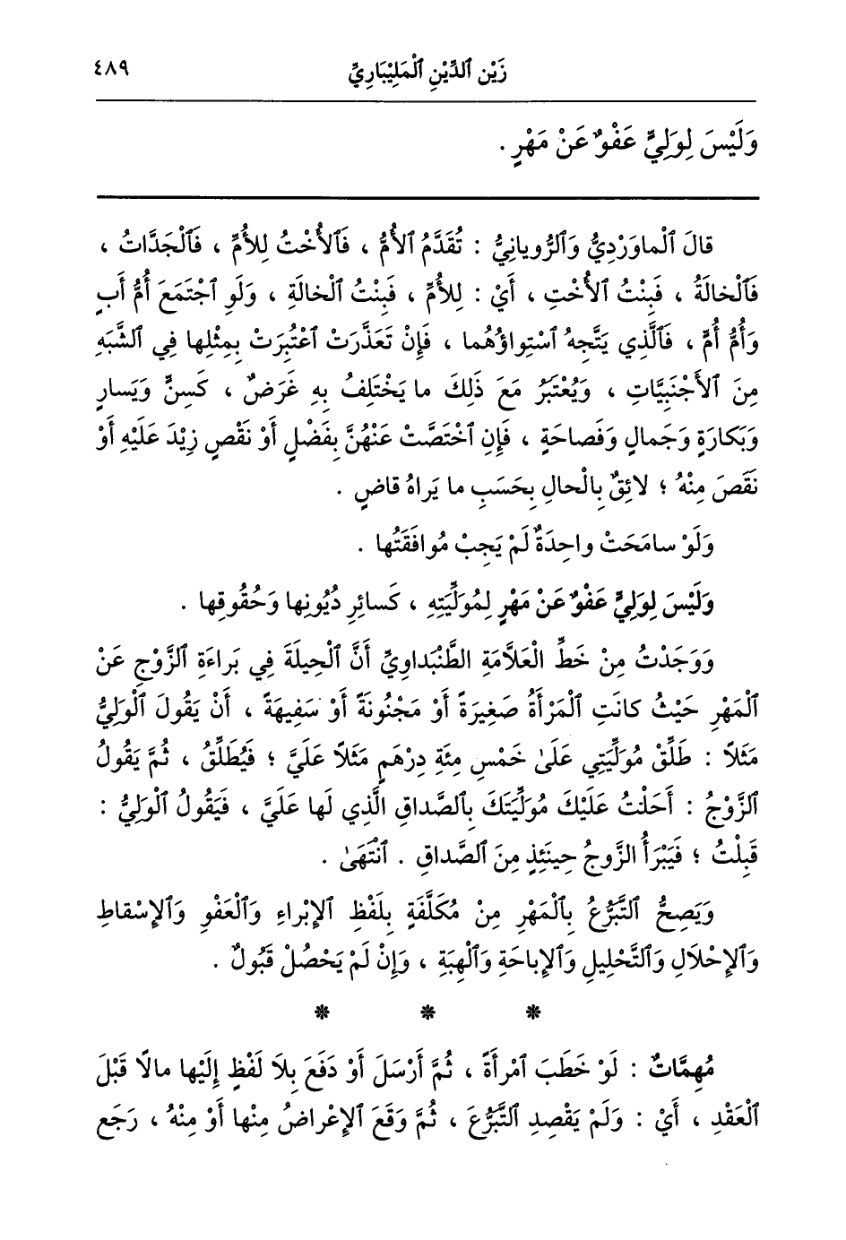 ووجدت من خط العلامة الطنبداوي أن الحيلة في براءة الزوج عن المهر حيث كانت المرأة صغيرة أو مجنونة أو سفيهة أن يقول الولي مثلا طلق موليتي على خمسمائة درهم مثلا علي فيطلق ثم يقول الزوج أحلت عليك موليتك بالصداق الذي لها علي فيقول الولي قبلت فيبرأ الزوج حينئذ من الصداق انتهى.