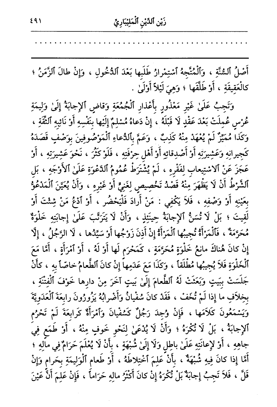 وتجب على غير معذور بأعذار الجمعة وقاض الإجابة إلى وليمة عرس عملت بعد عقد لا قبله إن دعاه مسلم إليها بنفسه أو نائبة الثقة وكذا مميز لم يعهد منه كذب وعم بالدعاء الموصوفين يوصف قصده كجيرانه وعشيرته أو أصدقائه أو أهل حرفته فلو كثر نحو عشيرته أو عجز عن الاستيعاب لفقره لم يشترط عموم الدعوة على الأوجه بل الشرط أن لا يظهر منه قصد تخصيص لغني أو غيره وأن يعين المدعو بعينه أو وصفه فلا يكفي من أراد فليحضر أو ادع من شئت أو لقيت بل لا تسن الإجابة حينئذ وأن لا يترتب على إجابته خلوة محرمة فالمرأة تجيبها المرأة إن أذن زوجها أو سيدها لا الرجل إلا إن كان هناك مانع خلوة محرمة كمحرم لها أو له أو امرأة أما مع الخلوة فلا يجيبها مطلقا وكذا مع عدمها إن كان الطعام خاصا به: كأن جلست ببيت وبعثت له الطعام إلى بيت آخر من دارها خوف الفتنة بخلاف إذا لم تخف فقد كان شعبان وأضرابه رابعة العدوية ويسمعون كلامها: فإن وجد رجل كسفيان وامرأة كرابعة لم تحرم الإجابة بل لا تكره وأن لا يدعي لنحو خوف منه أو طمع في جاهه أو لإعانته على باطل ولا إلى شبهة بأن لا يعلم حرام في ماله أما إذا كان فيه شبهة بأن علم اختلاطه أو طعام الوليمة بحرام وإن قل فلا تجب إجابة بل تكره إن كان أكثر ماله حراما فإن علم أن عين