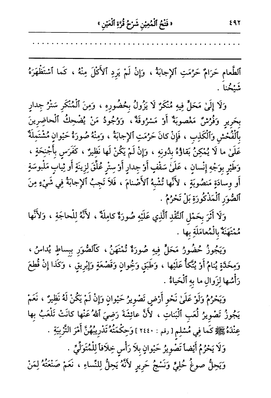 ولا إلى محل فيه منكر لا يزول بحضوره ومن المنكر ستر جدار بحرير وفرش مغصوبة أو مسروقة ووجود من يضحك الحاضرين بالفحش والكذب فإن كان حرمت الإجابة ومنه صورة حيوان مشتملة على ما لا يمكن بقاؤه بدونه وإن لم يكن لها نظير كفرس بأجنحة وطير بوجه إنسان على سقف أو جدار أو ستر علق لزينة أو ثياب ملبوسة أو وسادة منصوبة لأنها تشبه الأصنام فلا تجب الإجابة في شيء من الصور المذكورة بل تحرم.