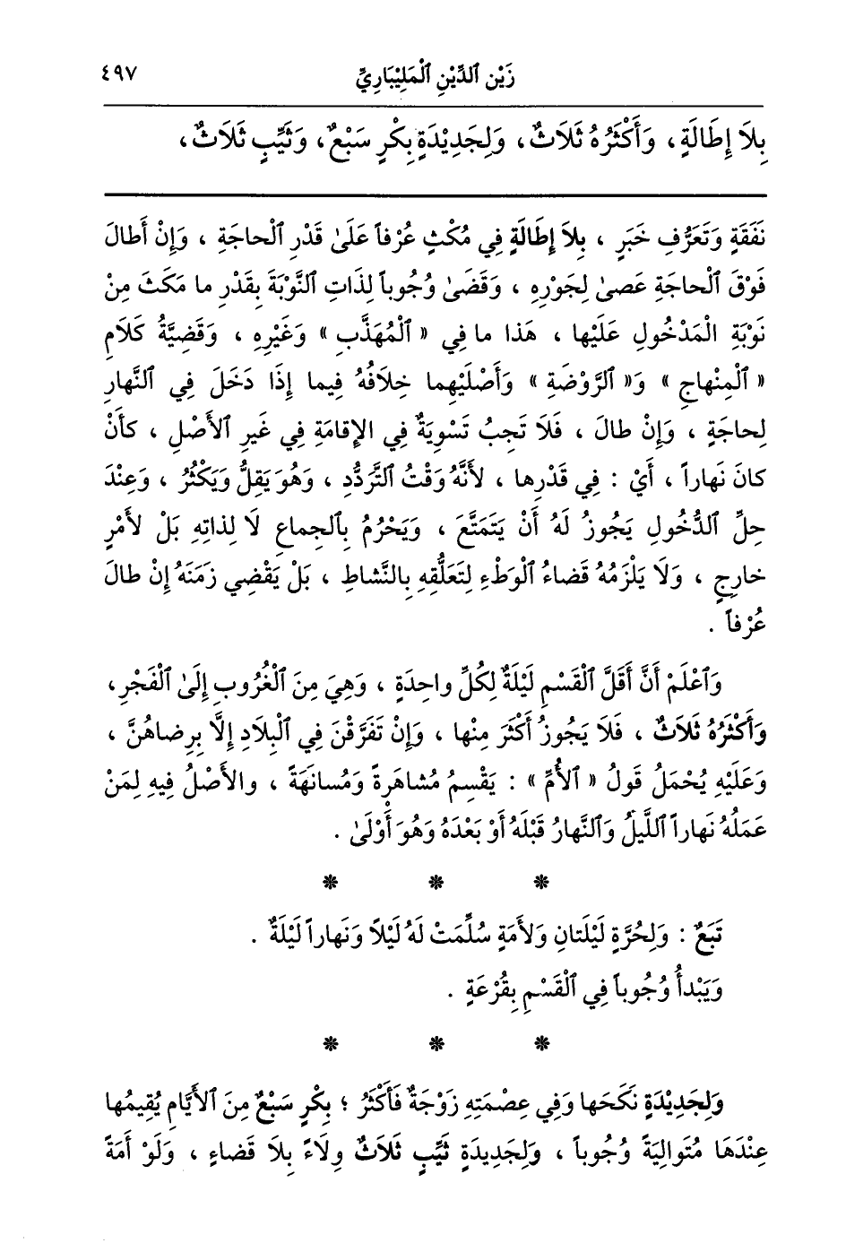 ولجديدة نكحها وفي عصمته زوجة فأكثر بكر سبع من الأيام يقيمها عندها متوالية وجوبا ولجديدة