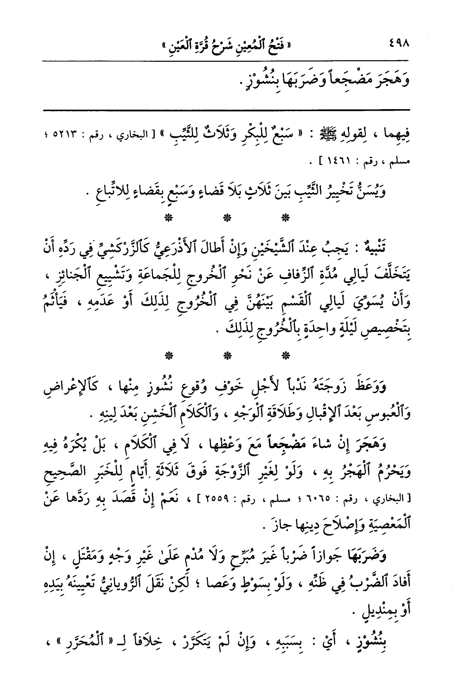 وهجر إن شاء مضجعا مع وعظها لا في الكلام بل يكره فيه ويحرم الهجر به ولو لغير الزوجة فوق ثلاثة أيام: للخبر الصحيح [البخاري رقم: 6065, مسلم رقم: 2559] نعم إن قصد به ردها عن المعصية وإصلاح دينها جاز.
