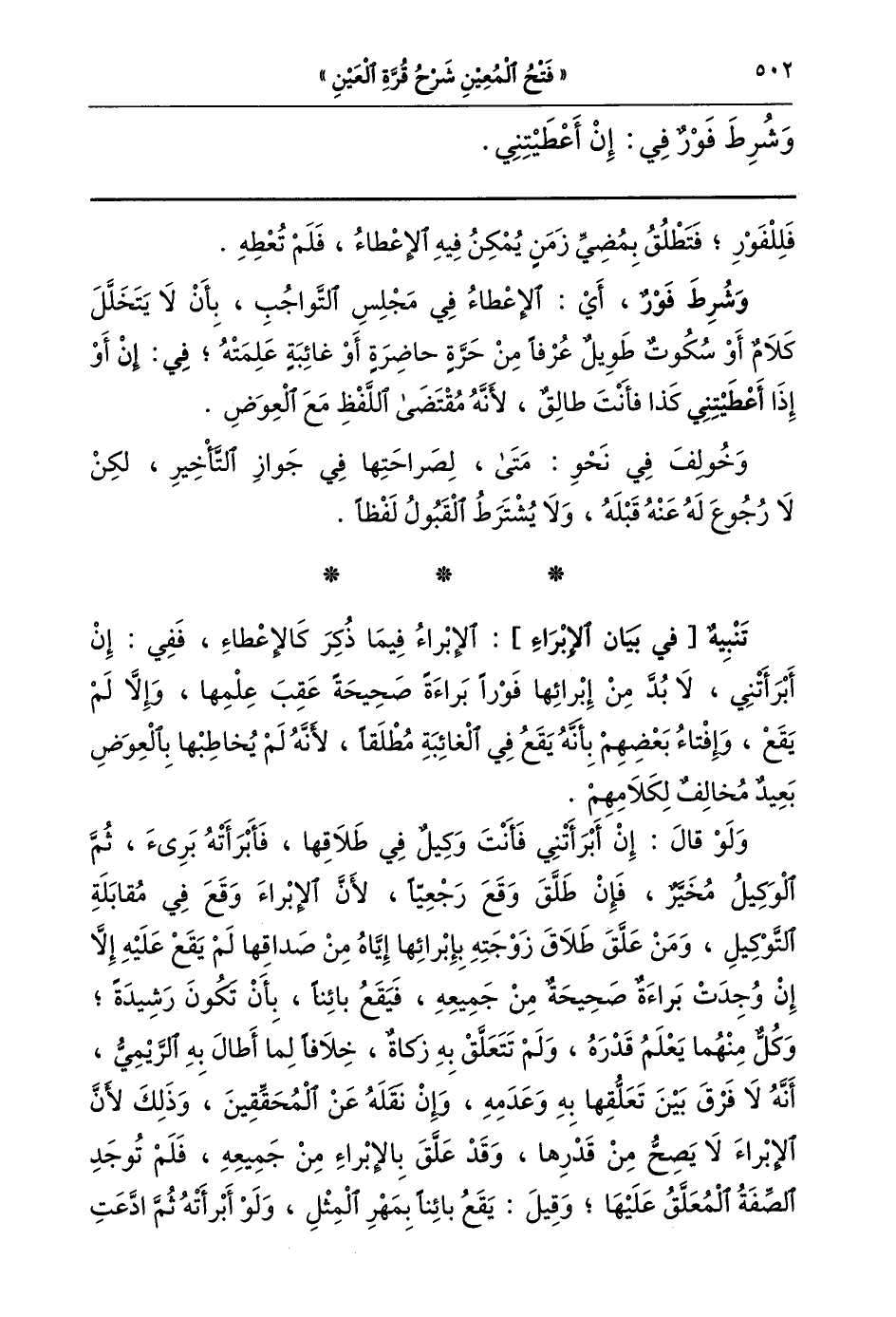 تنبيه الإبراء فيما ذكر كالإعطاء ففي إن أبرأتني لا بد من إبرائها فورا براءة صحيحة عقب علمها وإلا لم يقع وإفتاء بعضهم بأنه يقع في الغائبة مطلقا لأنه لم يخاطبها بالعوض بعيد مخالف لكلامهم.