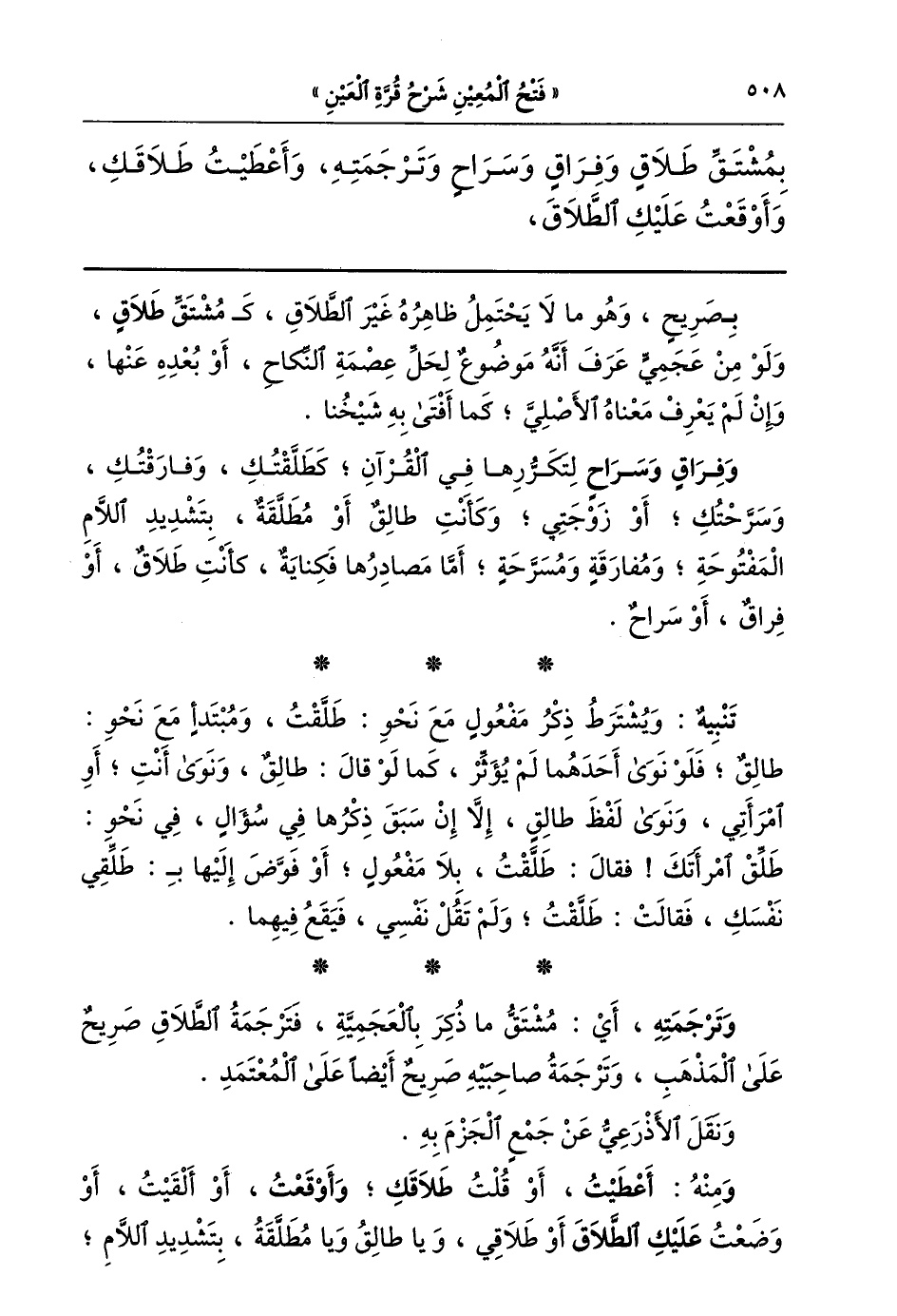 وفراق وسراح لتكررها في القرآن كطلقتك وفارقتك وسرحتك أو زوجتي وكأنت طالق أو مطلقة بتشديد اللام المفتوحة ومفارقة ومسرحة أما مصادرها فكناية كأنت طلاق أو فراق أو سراح.