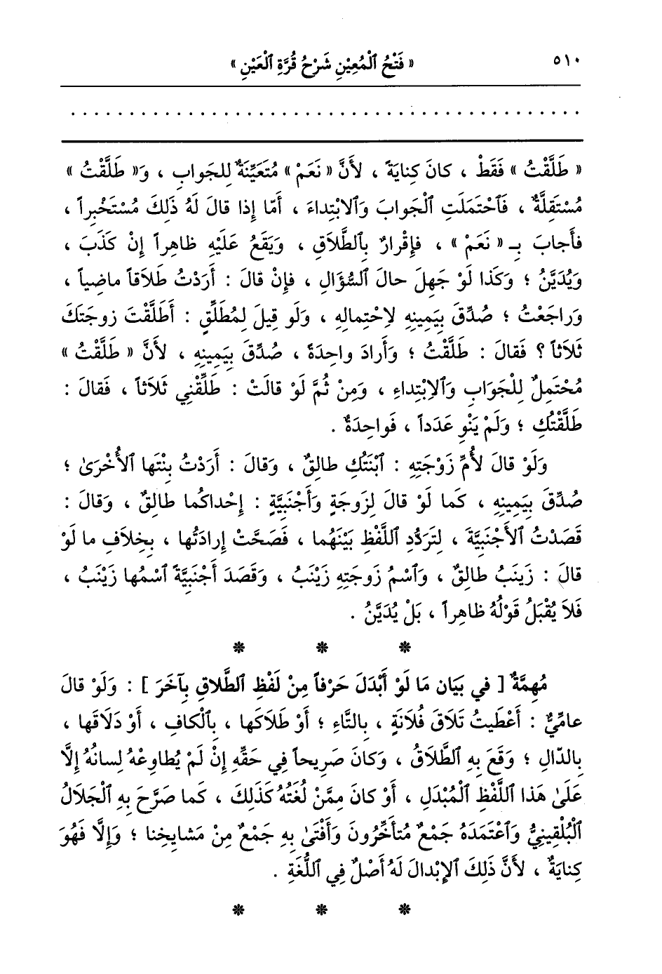 مهمة: [في بيان ما لو أبدل حرفا من لفظ الطلاق بآخر] ولو قال عامي أعطيت تلاق فلانة بالتاء أو طلاقها بالكاف أو دلاقها بالدال وقع به الطلاق وكان صريحا في حقه إن لم يطاوعه لسانه إلا على هذا اللفظ المبدل أو كان ممن لغته كذلك كما صرح به الجلال البلقيني واعتمده جمع متأخرون وأفتى به جمع من مشايخنا وإلا فهو كناية لان ذلك الإبدال له أصل في اللغة.