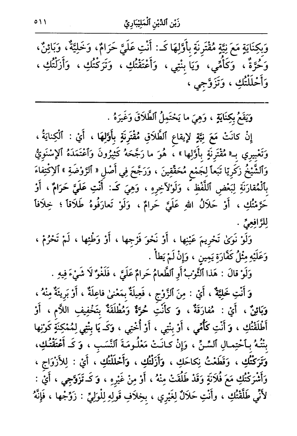 وبكناية مع نية مقترنة بأولها كـ: أنت علي حرام وخلية وبائن وحرة وكأمي ويا بنتي وأعتقتك وتركتك وأزلتك وأحللتك وتزوجي,