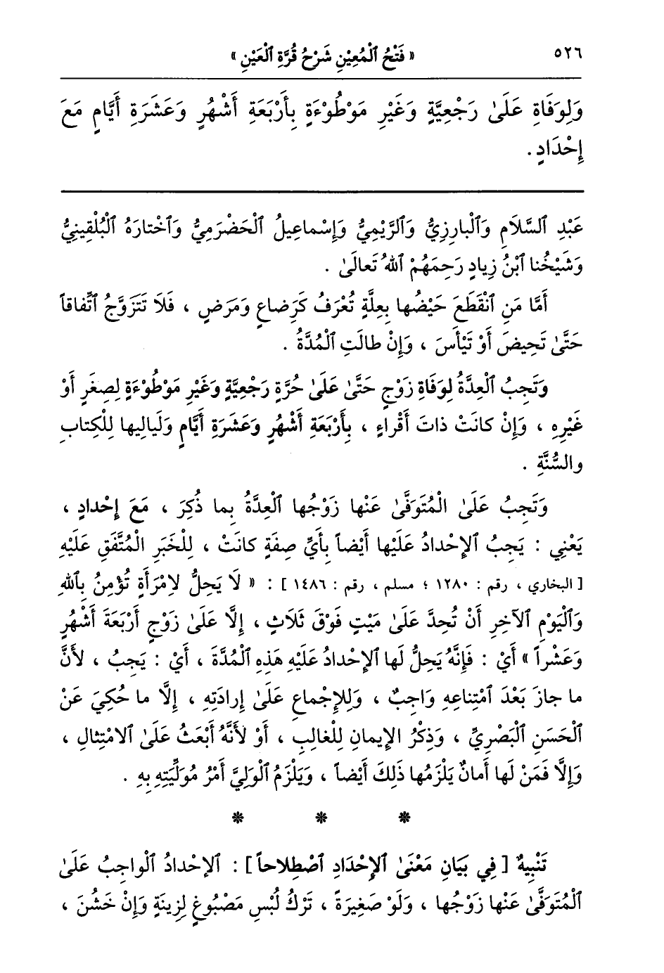 تنبيه [في بيان معنى الإحداد اصطلاحا] الإحداد الواجب على المتوفى عنها زوجها ولو صغيرة ترك لبس مصبوع لزينة وإن خشن.