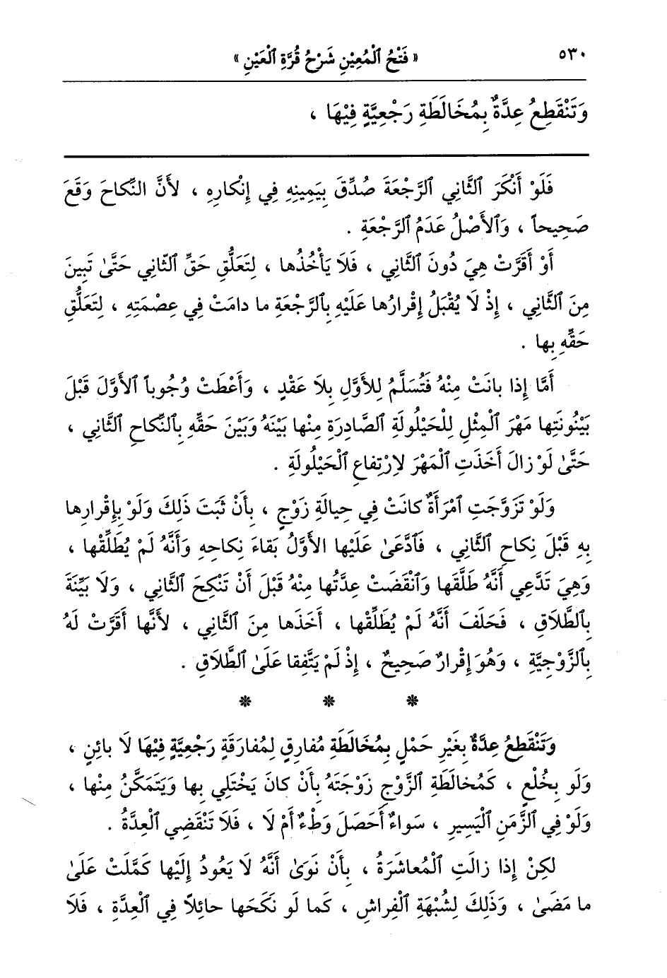 ولو تزوجت امرأة كانت في حيالة زوج بأن ثبت ذلك ولو بإقرارها به قبل نكاح الثاني فادعى عليها الأول بقاء نكاحه وأنه لم يطلقها وهي تدعي أنه طلقها وانقضت عدتها منه قبل أن تنكح الثاني ولا بينة بالطلاق فحلف أنه لم يطلقها أخذها من الثاني لأنها أقرت له بالزوجية وهو إقرار صحيح إذ لم يتفقا على الطلاق. وتنقطع عدة بغير حمل بمخالطة مفارق لمفارقة رجعية فيها لا بائن ولو بخلع كمخالطة الزوج زوجته بأن كان يختلي بها ويتمكن عليها ولو في الزمن اليسير سواء أحصل وطئ أم لا فلا تنقضي العدة.