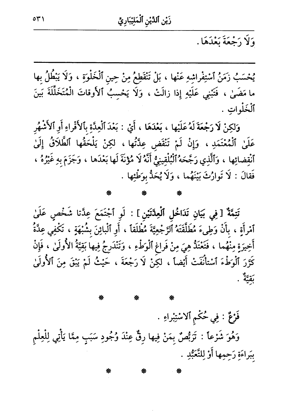 تتمة [في بيان تداخل العدتين] : لو اجتمع عدتا شخص على امرأة بأن وطئ مطلقته الرجعية مطلقا أو البائن بشبهة تكفي عدة أخيرة منهما فتعتد هي من فراغ الوطء وتندرج فيها بقية الأولى فإن كرر الوطء استأنفت أيضا لكن لا رجعة حيث لم يبق من الأولى بقية.