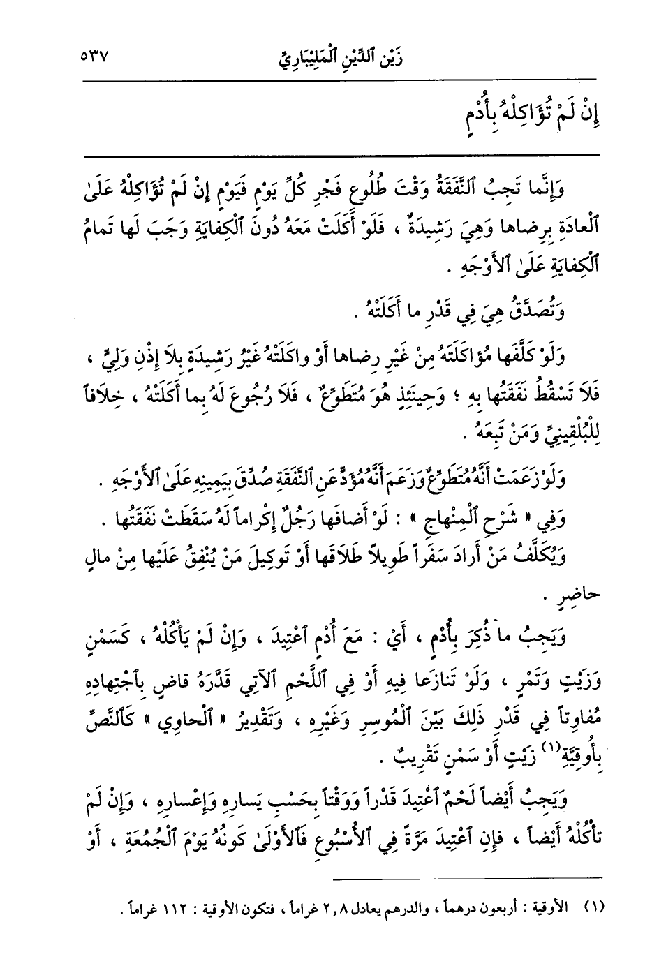 ويجب ما ذكر بأدم أي مع أدم اعتيد وإن لم تأكله كسمن وزيت وتمر ولو تنازعا فيه أو في اللحم الآتي قدره قاض باجتهاده مفاوتا في قدر ذلك بين الموسر وغيره وتقدير الحاوي كالنص بأوقية1 زيت أو سمن تقريب. ويجب أيضا لحم اعتيد قدرا ووقتا بحسب يساره وإعساره وإن لم تأكله أيضا فإن اعتيد مر في الأسبوع فالأولى كونه يوم الجمعة أو