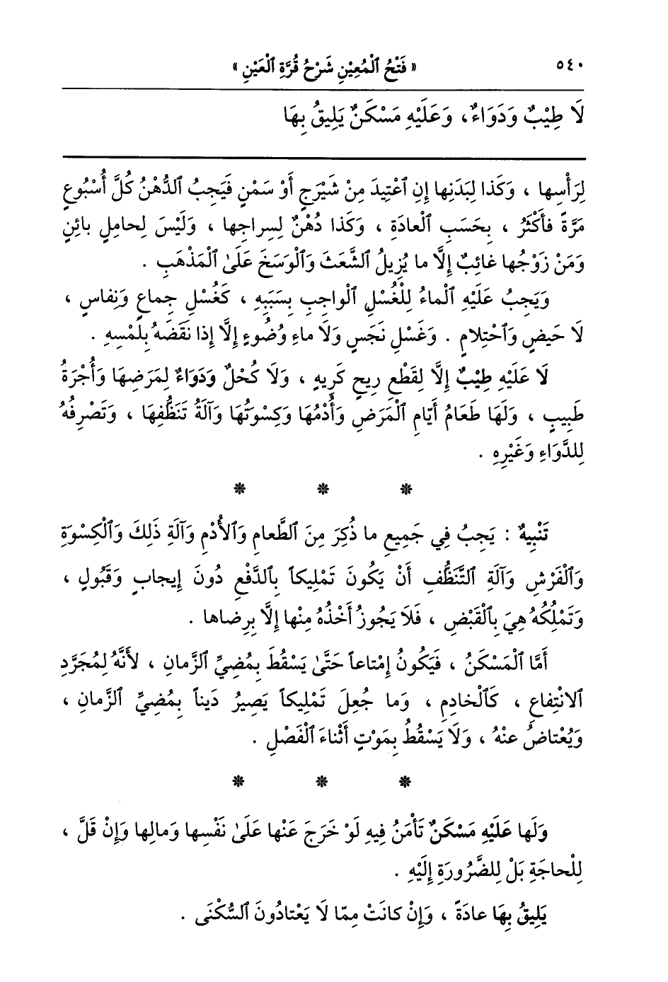 لرأسها وكذا لبدنها إن اعتيد من شيرج أو سمن فيجب الدهن كل أسبوع مرة فأكثر بحسب العادة وكذا دهن لسراجها وليس لحامل بائن ومن زوجها غائب إلا ما يزيل الشعث والوسخ على المذهب.