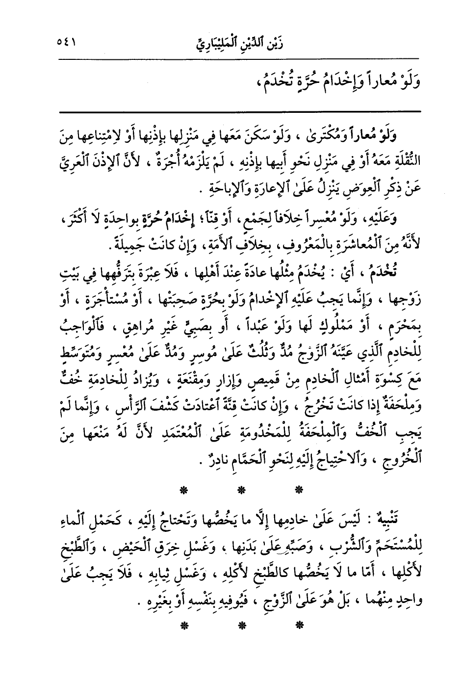 تنبيه: ليس على خادمها إلا ما يخصها وتحتاج إليه كحمل الماء للمستحم والشرب وصبه على بدنها