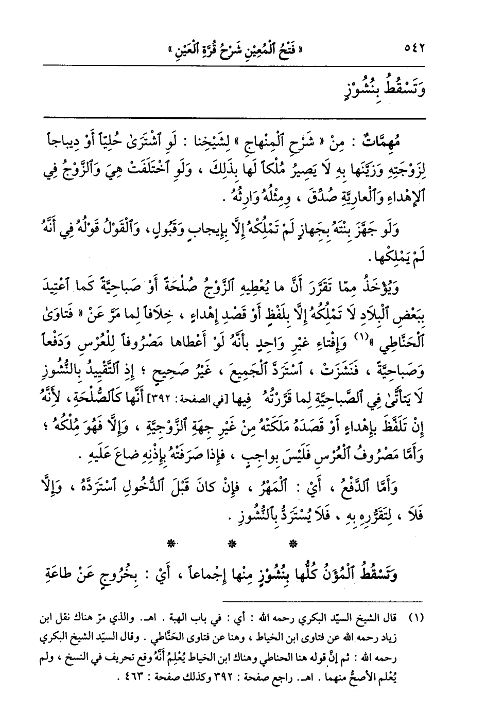 ويؤخذ مما تقرر أن ما يعطيه الزوج صلحة أو صباحية كما اعتيد ببعض البلاد لا تملكه إلا بلفظ أو قصد إهداء خلافا لما مر عن فتاوى الحناطي1 وإفتاء غير واحد بأنه لو أعطاها مصروفا للعرس ودفعا وصباحية فنشزت استرد الجميع غير صحيح إذ التقييد بالنشوز لا يتأتى في الصباحية لما قررته فيها [في الصفحة: 392] أنها كالصلحة لأنه إن تلفط بإهداء أو قصده ملكته من غير جهة الزوجية وإلا فهو ملكه وأما مصروف العرس فليس بواجب فإذا صرفته بإذنه ضاع عليه.